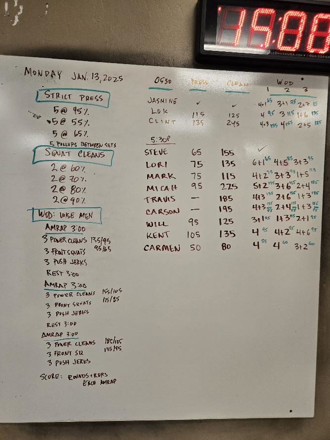 | Strict Press Mon Jan 13 2025 | Squat Cleans Mon Jan 13 2025 | Wise Men |