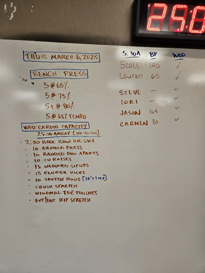 Bench Press Thu Mar 6 2025(Weight) 5@65% 5@75% 5+@80% 5@65% tempo |
