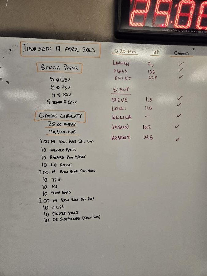 | Bench Press Thu Apr 17 2025 | Cardio Capacity Thu Apr 17 2025 |