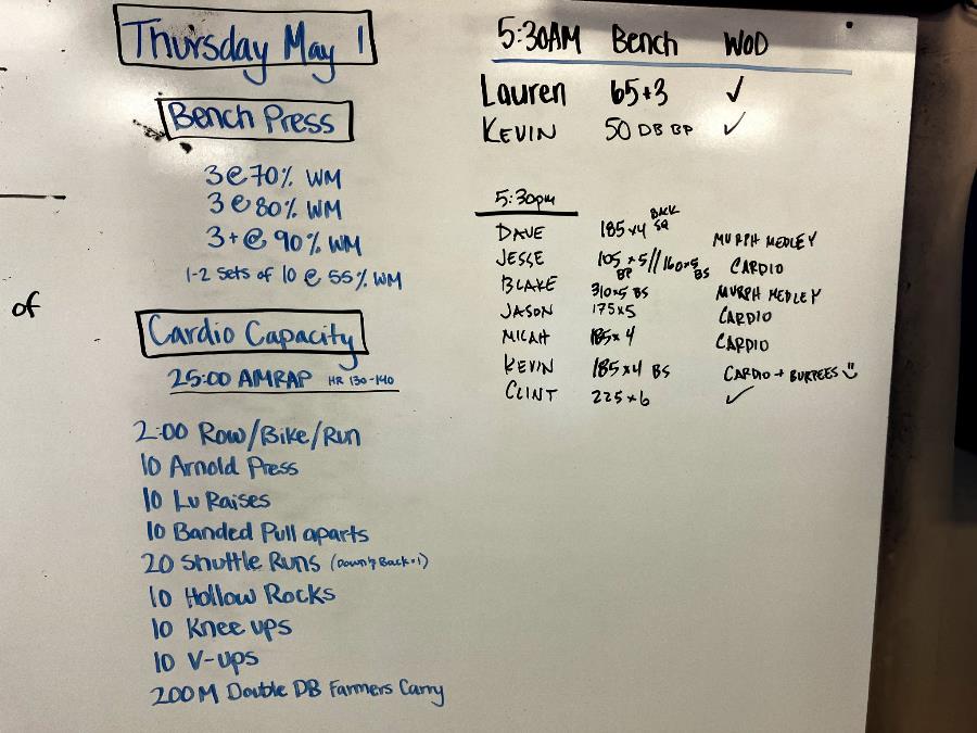 Bench Press Thu May 1 2025(Weight) All reps based on 90% of your 1RM. This is your Working Max (WM) 3@70% WM 3@80% WM 3+@90% WM 1-2 sets of 10 @55% WM |