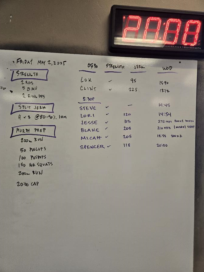 | Strength Accessory Fri May 2 2025 | Split Jerk Fri May 2 2025 | Murph Prep Fri May 2 2025 |