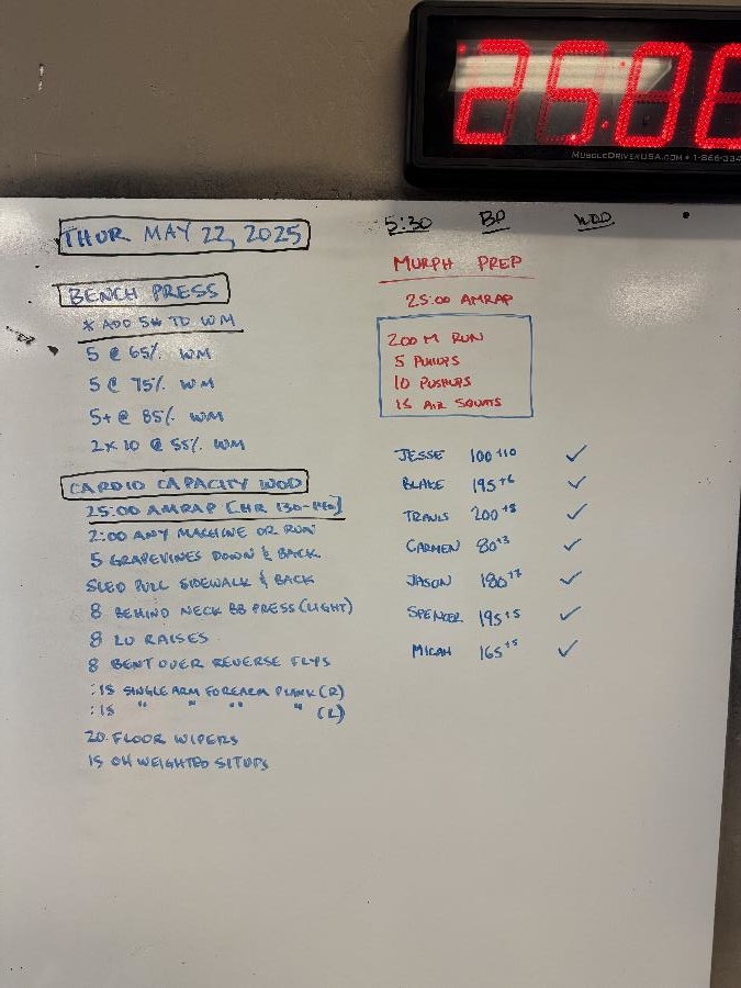 Bench Press Thu May 22 2025(Weight) *add 5# to your working max 5@65% WM 5@75% WM 5+@85% WM 2x10@55% WM |