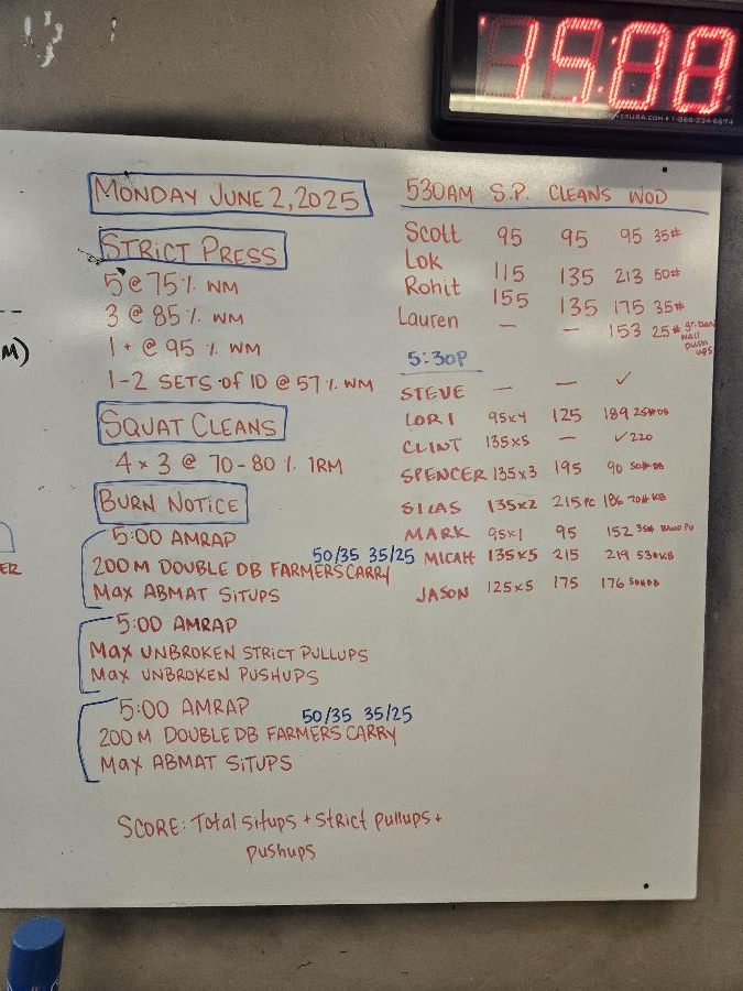 | Strict Press Mon Jun 2 2025 | Squat Cleans Mon Jun 2 2025 | Burn Notice |