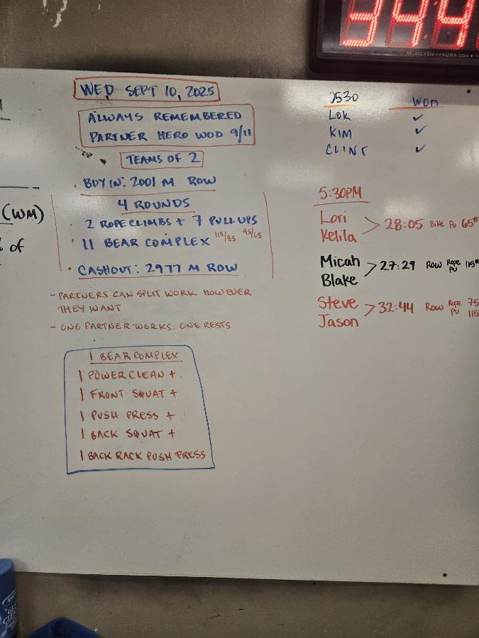 Always Remembered Partner HERO WOD(Time) 911 HERO WOD: 'Always Remembered' Teams of 2: Buy-In: 2001 Meter Row 4 Rounds: 2 Rope Climbs + 7 Pullups 11 Bear Complexes (115/85)95/65 Cash-Out: 2977 Meter Row Teammates can split up the work however they see fit. One partner works. One rests. If teammates are using different weights, it's ok to use 2 barbells 1 Bear Complex: 1 Power Clean + 1 Front Squat + 1 Push Press + 1 Back Squat + 1 Back Rack Push Press SUBSTITUTION: If you're not able to or are not comfortable bringing the bar behind your neck from overhead, complete the complex below: 1 Power Clean + 1 Front Squat + 1 Push Press + 1 Front Squat + 1 Push Press MEANING • “Always Remembered” is an annual workout done to honor those who lost their lives on 9/11/01 in the terrorist attacks in New York City • The 2001 meter row represents the year. • The 4 rounds represents the four planes. • The 2 Rope Climbs + 7 Pullups = 9 reps represents the month • The 11 Bear Complexes represent the day. • The 2977 meter row represents the lives lost BUY-IN ROW • Looking for quick bursts on the rowers while the other partner rests • Switching every 200 meters gets the work done in 5 sets each • Switching every 250 meters gets the workout done in 4 sets each BARBELL • Switching with your partner after a single repetition will likely be the most consistent option across all 4 rounds CASH-OUT ROW • Switching every 200 meters gets the work done in around 7-8 sets each • Switching every 250 meters gets the workout done in around 6 set |
