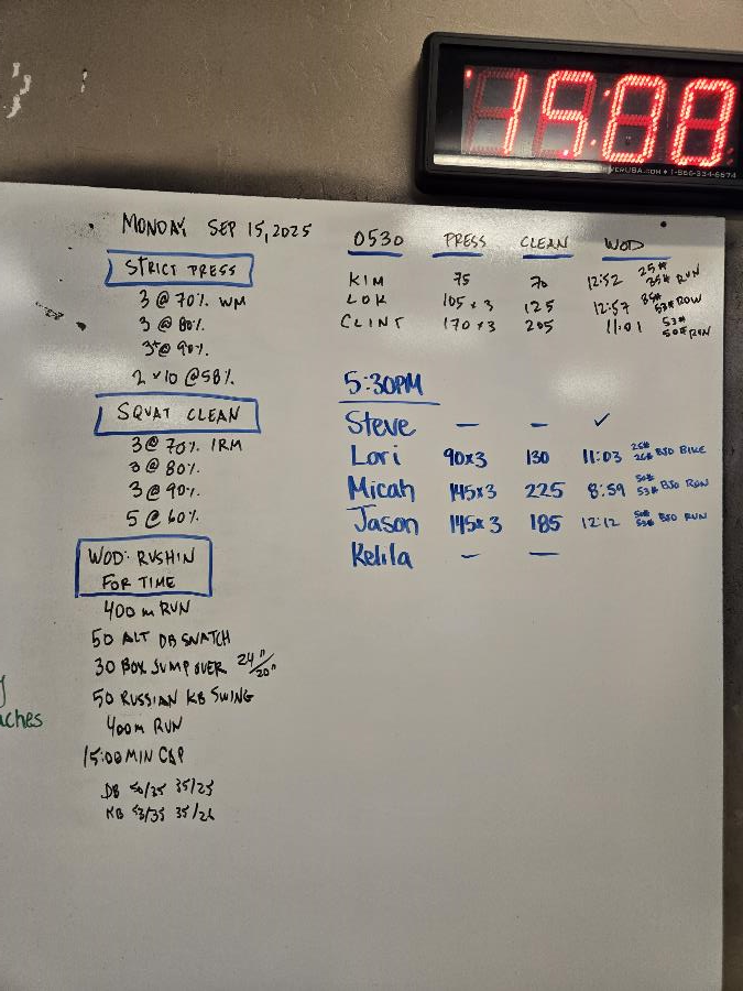 | Strict Press Mon Sep 15 2025 | Squat Clean Mon Sep 15 2025 | Rushin |