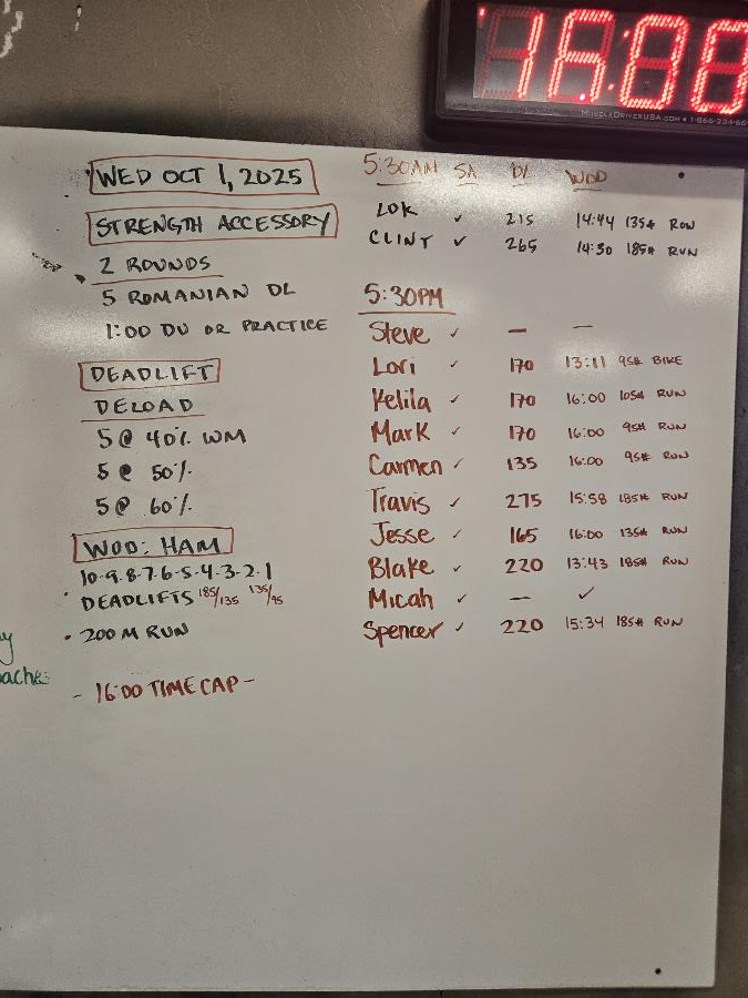 Strength Accessory Wed Oct 1 2025(No Results Tracked) 2 rounds 5 romanian deadlifts 1:00 double unders or practice |