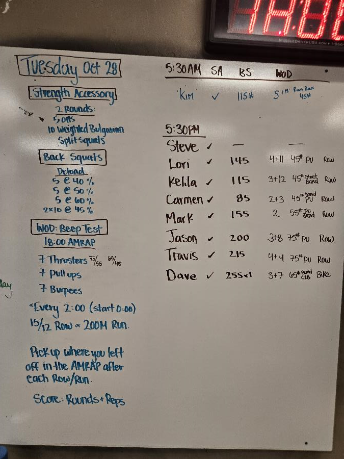 | Strength Accessory Tue Oct 28 2025 | Back Squats Deload Tue Oct 28 2025 | Beep Test |