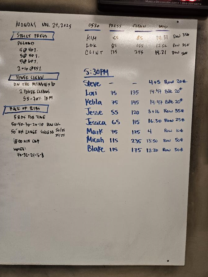 | Strict Press Deload Mon Nov 24 2025 | Power Clean Mon Nov 24 2025 | Rack of Ribs |