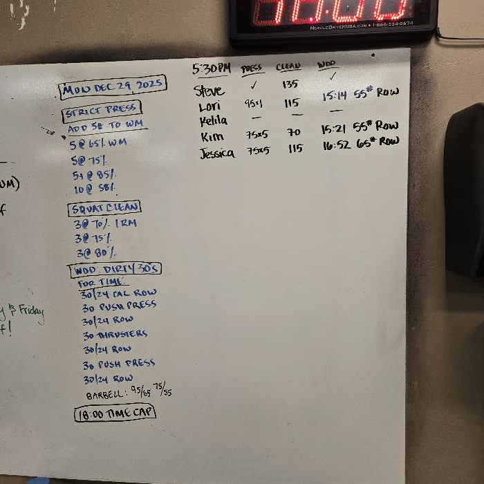 | JOIN US FOR NEW YEARS DAY PARTNER WOD | Strict Press Mon Dec 29 2025 | Squat Clean Mon Dec 29 2025 | Dirty 30s |