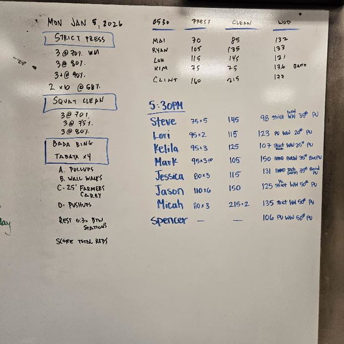 (Reps) Tabata 8 sets each :20 work/:10 rest (4:00 each station) A. Pullups B. Wall Walks C. 25' Farmers Carries 35/25 50/35 D. Pushups *Rest :30 bw stations