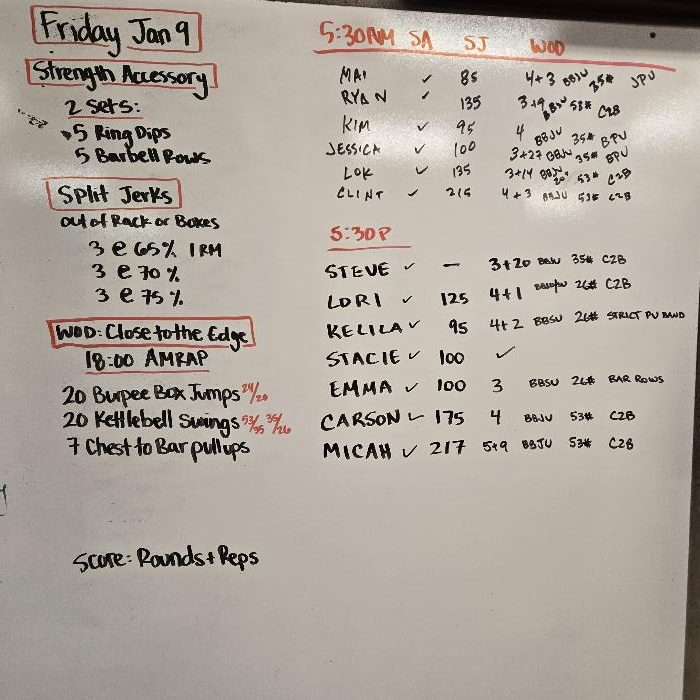 | Strength Accessory Fri Jan 9 2026 | Split Jerks Fri Jan 9 2026 | Close to the Edge |
