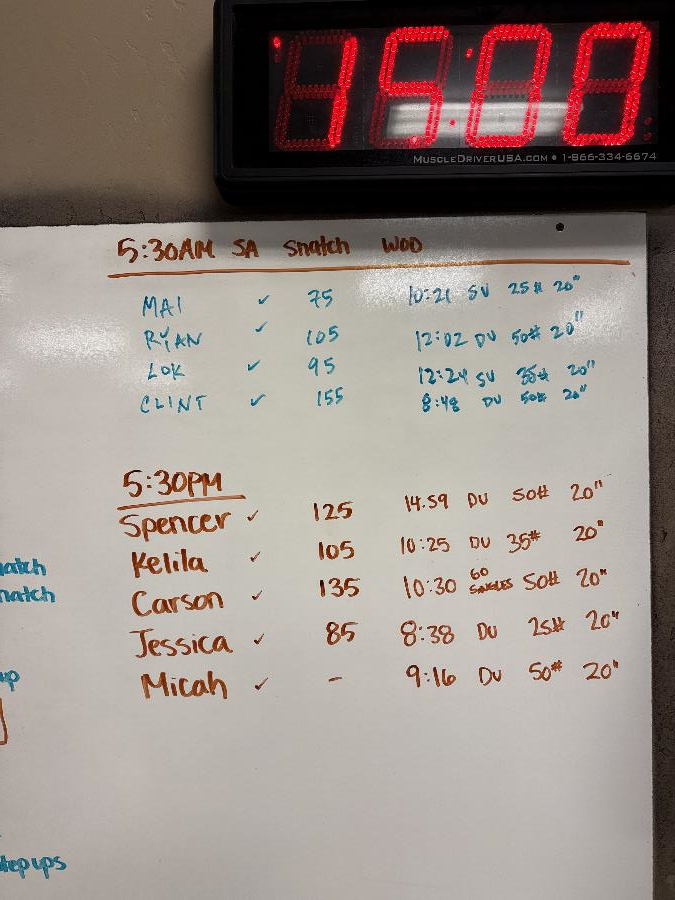Snatch Complex Fri Jan 30 2026 (Weight) 3 sets 2 snatch grip deadlifts 1 low hang power snatch 1 high hang power snatch 1 power snatch start light and work up in weight