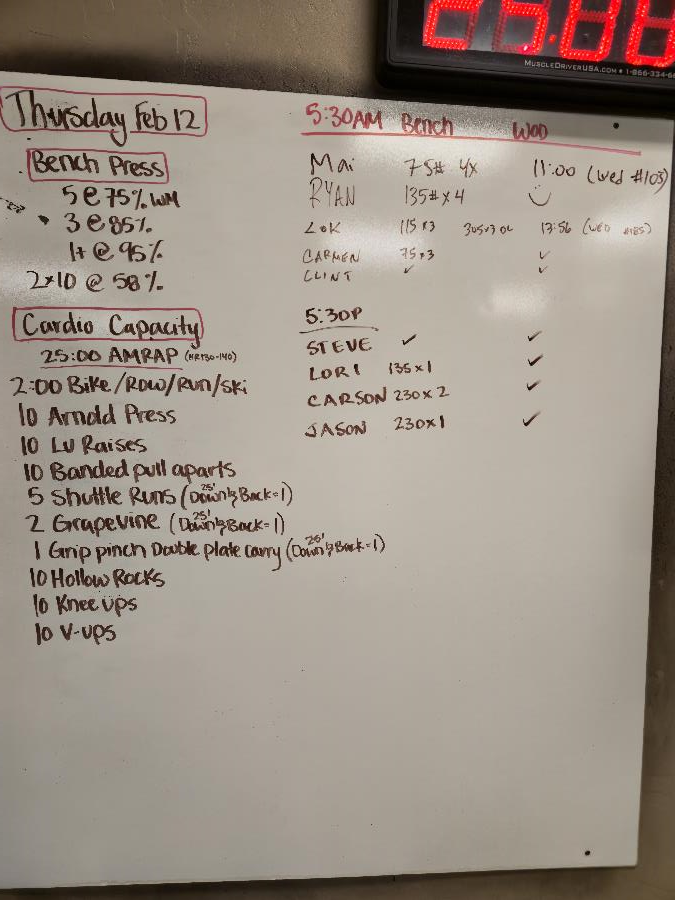 (No Results Tracked) 25:00 AMRAP (HR 130-140) 2:00 run bike row or ski 10 arnold press 10 lu raise 10 banded pull aparts 5 shuttle runs (25' down and back =1 rep) 2 grapevine (25' down and back = 1 rep) 1 grip pinch double plate carry (25' down and back = 1 rep) 10 hollow rocks 10 kneeups 10 vups