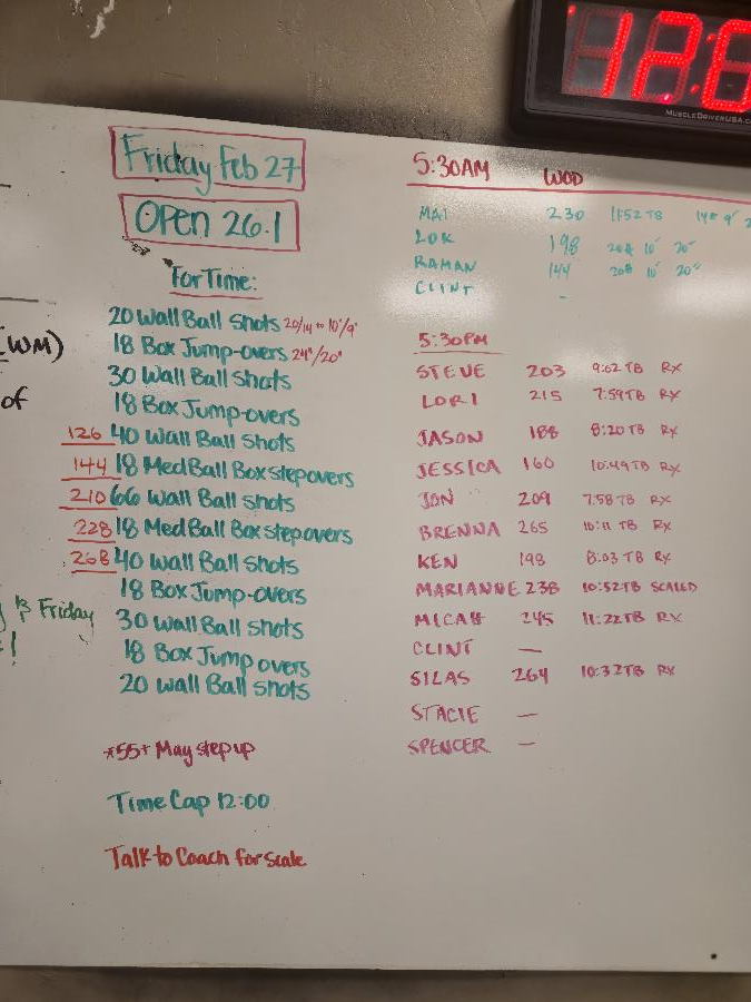 Open 26.1(Time) ** We'll be at the gym at 5:00 pm. First heat starts at 5:30 pm! For time: 20 wall-ball shots 20/14 to 10'/9' 18 box jump-overs 24'/20' 30 wall-ball shots 18 box jump-overs 40 wall-ball shots 18 medicine-ball box step-overs 66 wall-ball shots 18 medicine-ball box step-overs 40 wall-ball shots 18 box jump-overs 30 wall-ball shots 18 box jump-overs 20 wall-ball shots *55+ may step up Time cap: 12 minutes Strategy: Wallballs: Unless you can complete 100 wallballs unbroken when fresh, do not plan to do any sets of wallballs unbroken. Break the set of 20 at least once, 30s twice, 40s three times, 66 at least 4 times. This will ensure a fast cycle rate and control your breathing. Keep your breaks to 3-5 seconds. Box Jump Overs: Do not push these. This is a place to get a small reprieve from the quad fatigue of wall balls. Medball Box Step Overs: Hold the wall ball on a shoulder to give your diaphragm a space to get deep breaths. Practice the most efficient step over pattern BEFORE starting the workout. Transitions: Keep them short! |