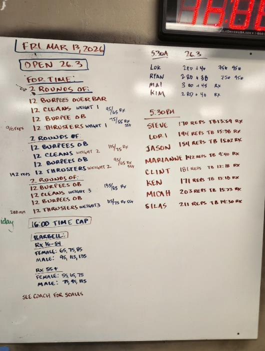 Open 26.3(Time) *we'll be at the gym at 5:00 pm. first heat starts at 5:30 pm ** For time: 2 rounds of: 12 burpees over the bar 12 cleans, weight 1 12 burpees over the bar 12 thrusters, weight 1 2 rounds of: 12 burpees over the bar 12 cleans, weight 2 12 burpees over the bar 12 thrusters, weight 2 2 rounds of: 12 burpees over the bar 12 cleans, weight 3 12 burpees over the bar 12 thrusters, weight 3 Time cap: 16 minutes Barbell: RX 16-54 Female: 65, 75, 85 lb Male: 95, 115, 135 lb RX 55+ Female: 55, 65, 75 lb Male: 75, 95, 115 lb ** Only 1 barbell allowed. Athletes must change their own weights. Collars must be placed outside of the weights. Time does not stop at any time during this workout. See coach for scaled options |