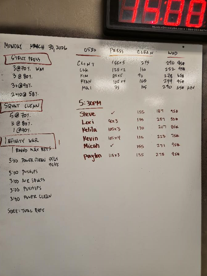 | Strict Press Mon Mar 30 2026 | Squat Clean Mon Mar 30 2026 | Infinity War (Benchmark) |