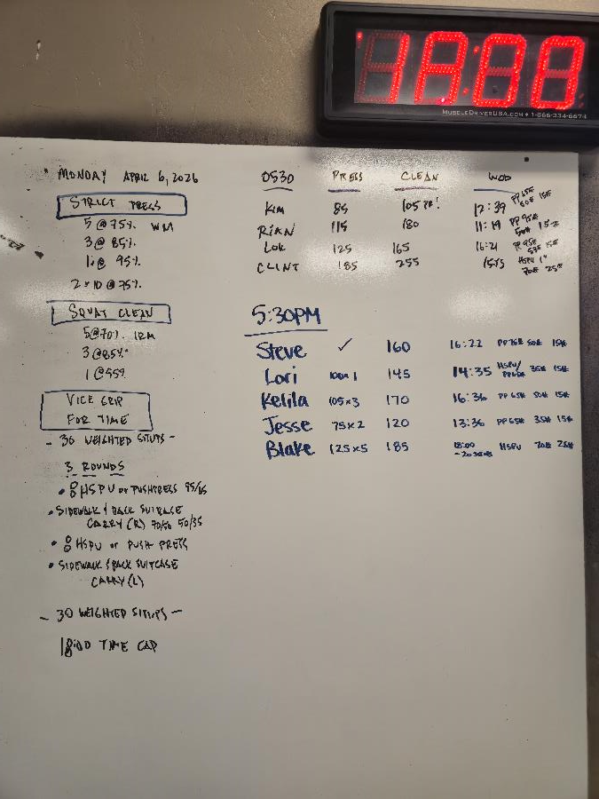 | Strict Press Mon Apr 6 2026 | Squat Clean Mon Apr 6 2026 | Vice Grip |